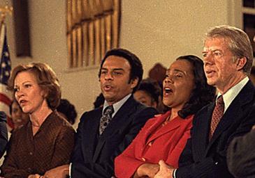 Keywords: Coretta scott king ebenezer.jpg Jimmy Carter and Rosalynn Carter sing with Andrew Young and Coretta Scott King together with Martin Luther King Sr and other civil rights leaders during a visit to Ebenezer Baptist Church in Atlanta 183007 01/14/1979 2006-01-31 accession number National Archives - ARC Identifier 183007 White House Staff Photographers <gallery> File Martin Luther King Sr c1977-81 jpg Different cropping from same original File Jimmy Carter and Rosalynn Carter sing with Martin Luther King Sr Coretta Scott King Andrew Young and other civil - NARA - 183007 tif uncropped </gallery> PD-USGov 1979 in Atlanta Churches in Atlanta Georgia Coretta Scott King Rosalynn and Jimmy Carter Andrew Young |