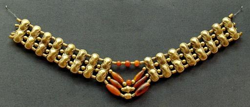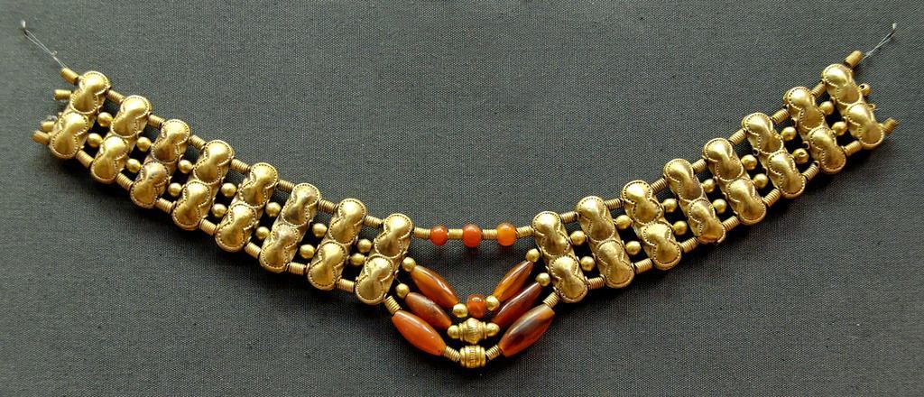 MAKE A MEME View Large Image Cornelian necklace BM GR1897.4-1.623.jpg Necklace with gold beads in the shape of double figure-of-eight shields spiral gold beads and cornelian beads Cypriot artwork with Mycenaean inspiration ca 1400-1200 BC From Enkomi Collier à perles ...