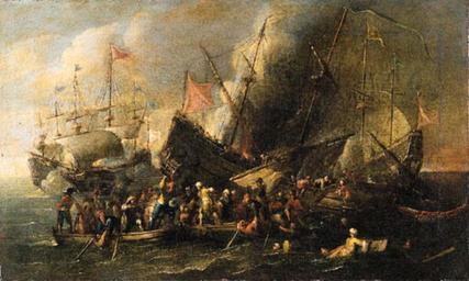 | Keywords: Cornelis de Wael - Naval battle between Turks and Christians.jpg Artwork Creator Cornelis de Wael en Naval battle between Turks and Christians 1613-1667 http //www christies com/lotfinder/lot/cornelis-de-wael-scontro-navale-tra-turchi-1357699-details aspx intObjectID 1357699 oil canvas Size cm 38 61 object history exhibition history credit line Sold at Christie's on 1 December 1998 Rome lot 187 accession number place of creation PD-old-100 Cornelis de Wael 17th-century landscape paintings 17th-century paintings of naval battles |