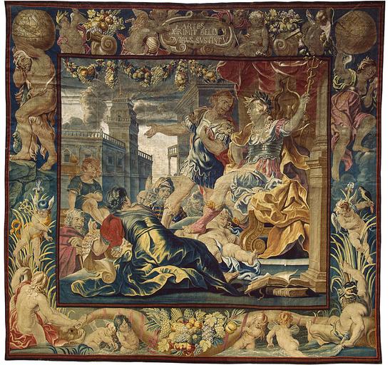 | Keywords: Cornelis Schut - Rhetoric.jpg Seven liberal arts Rhetoric http //www hermitagemuseum org/wps/portal/hermitage/digital-collection/11 +Textiles 2C+Tapestry/264760/ lng en 377 x 398 cm tapestry Part of a series of seven tapestries esigned by Cornelis Schut and woven in the Brussels workshop The series was very popular and repeatedly produced in Bruges workshops - as we know from surviving tapestries bearing the mark of this city - with three different versions of the borders The borders on the five tapestries from the series in the Hermitage have male and female figures in complicated poses and children with cornucopias which are unlike the borders on true products of Bruges In the centre of the upper border is a cartouche with the inscription Artes Deprifit bellum agvibus sustinatus War oppresses the arts which support it also designed by Cornelis Schut Brussels archives record that in 1661 Jan Leyniers 1628-1687 was accorded the right to produce this series and it is possible that the Hermitage tapestries should be seen as his work This allows us to date the tapestries to the second half of the 17th century Another argument in favour of a Brussels origin is the difference in colour to works by Bruges masters the latter tending to be characterized by a daring combination of bright lilacs violets and purples not found in Brussels products Institution Hermitage Museum c 1650-1700 PD-old-100 Tapestries designed by Cornelis Schut Seven liberal arts Tapestries in the Hermitage |