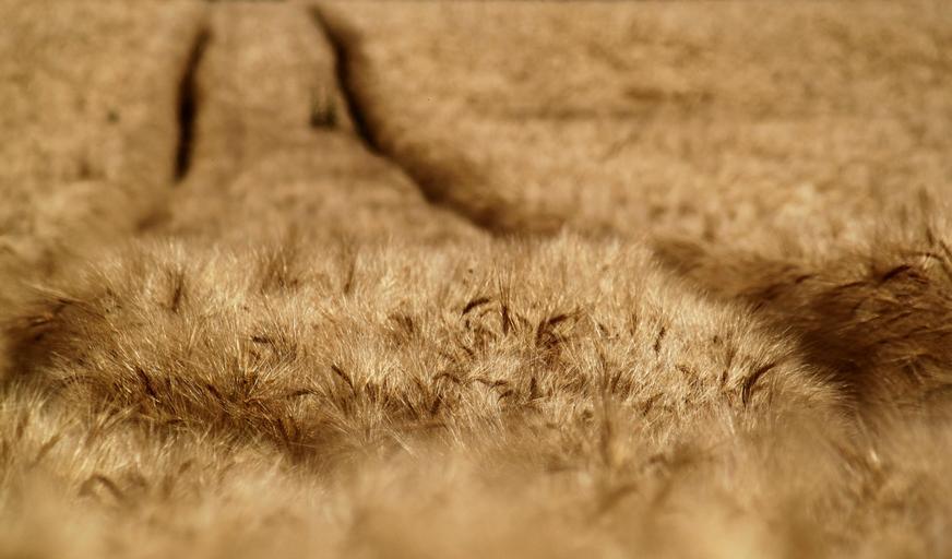 Keywords: cornfield field cereals summer agriculture arable grain harvest spike wheat field nature wheat spike plant food ready to be harvested tire tracks tractor tracks golden yellow cereal grains