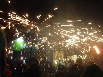 | Keywords: Correfocs (literally in English "fire-runs") are among the most striking features present in Catalan festivals. In the correfoc, a group of individuals will dress as devils and light fireworks - fixed on devil's pitchforks or strung above the route. Dancing to the sound of a rhythmic drum group, they set off their fireworks among crowds of spectators. The spectators that participate dress to protect themselves against small burns and attempt to get as close as possible to the devils... running with the fire. Other spectators will watch from 'safe' distances, rapidly retreating as necessary. culture catalan correfoc terrassa països catalans fmterrassa2016 |