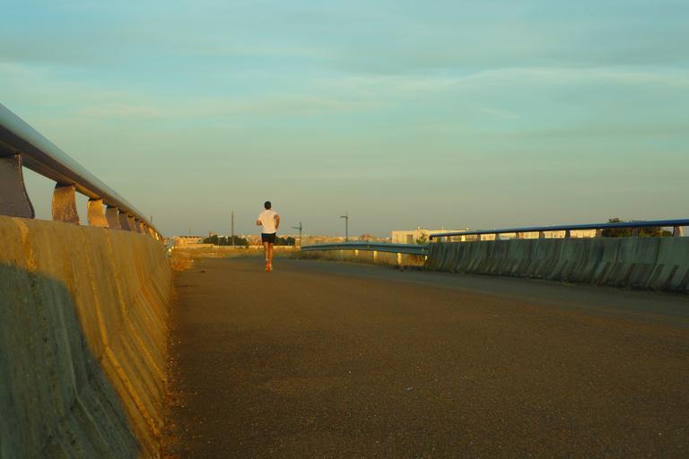 Keywords: corridor athlete bridge gateway sunset career solo sport effort exercise summer parapets heat sky blue