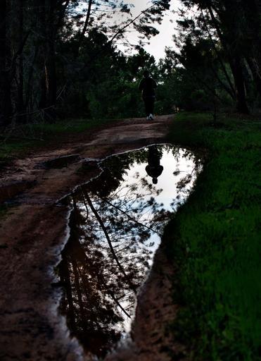 Keywords: corridor walk pinewood water reflection dark trees path puddle