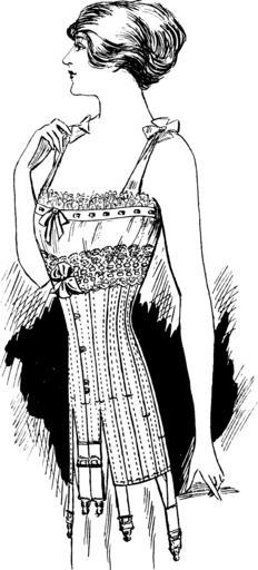 | Keywords: CorsetQ-602-$8.png Q-602 ” 8; Q-602 ”A new spring L R model in coutil having a long waist and medium sized bust The long skirt encloses the figure comfortably and gives unusually graceful lines 8 Store Home; ISSUED AT PHILA VOL 2 No 3; THE BRIDES' NUMBER 1911; Wauamaker's; page 6 April and May 1911 anonymous PD PD-old Post-Edwardian long line Line art of women in corset Fashion in 1911 | ||||