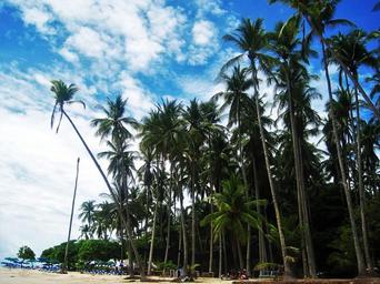 Keywords: costa rica pacific beach high palm trees exotic tropical sky holiday palm trees recovery relaxation paradise beach sun loungers central american land resort palm trees and sky