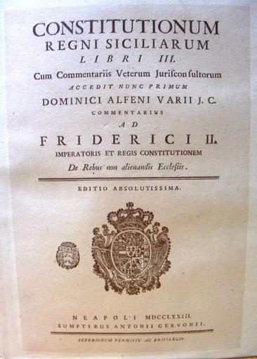 Keywords: Costitutionum Regni Siciliarum.LibriIII.JPG en Costitutionum Regni Siciliarum Libri III The first page 2012-09-13 15 26 25 Costitutionum Regni Siciliarum Libri III cum commentariis veterum juris consultorum Dominici Alfeni Varii J C commentarius ad Federicii IIa Neapoli 1773 Antonio Cervoni published in 1773 A C PD-old-auto Uploaded with UploadWizard Kingdom of Sicily Deeds of Frederick II Holy Roman Emperor Magna Curia Sicily Ancient documents Magna Curia |