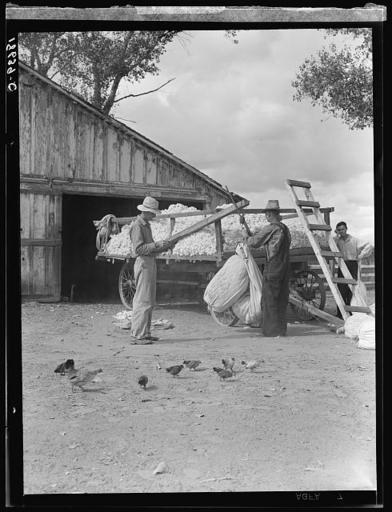 | Keywords: Cotton Farming 1930s.jpg en Small cotton farm Kern County California The farmer keeps accounts Each picker weighs his sack of cotton In this case the sack weighs approximately fifty pounds Took three hours to pick for which on basis of seventy-five cents per one hundred 2013-12-03 11 49 03 Farm Security Administration Dorothea Lange PD-USGov Uploaded with UploadWizard Cotton fields in the United States | ||||