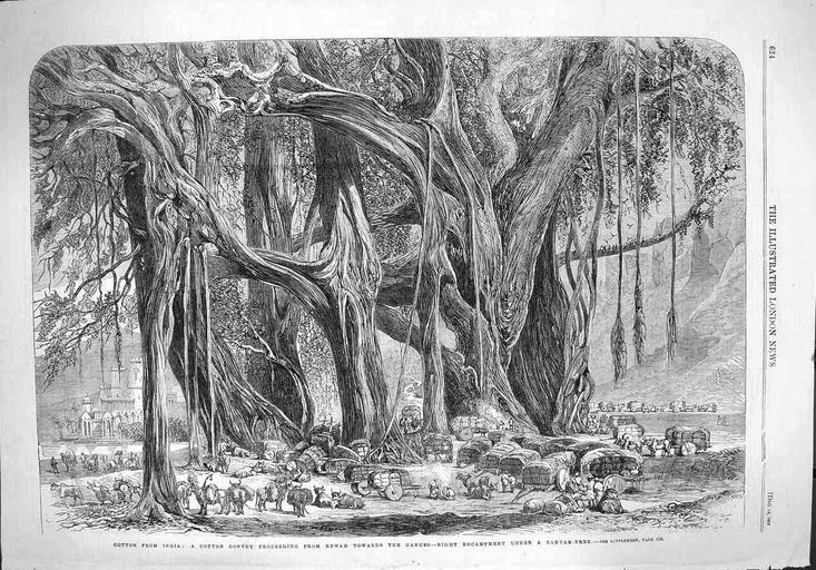 | Keywords: Cotton from India.jpg en Cotton from India a cotton convoy proceeding from Rewah towards the Ganges--night encampment under a banyan tree from the Illustrated London News 1862; a closer look at the cotton carts ; also A cotton fleet descending the Ganges--casting off from Mirzapore early in the morning ; also The cotton famine Source ebay Oct 2005 1862 http //www columbia edu/itc/mealac/pritchett/00routesdata/1700_1799/trade/cotton/cotton html Illustrated London News other versions PD-Art Uploaded with UploadWizard The Illustrated London News |