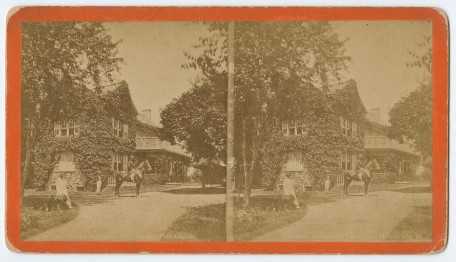 | Keywords: stereographs chestnut hill chestnuthill philadelphia houses photo border Shows a large house with extensive grounds in Chestnut Hill, Philadelphia. In front of the house, a horse with rider and two men stand on a path lined with trees and grass. Grounds include an ivy-covered stone building. Accession number: P.2011.47.713 Shows a large house with extensive grounds in Chestnut Hill, Philadelphia. In front of the house, a horse with rider and two men stand on a path lined with trees and grass. Grounds include an ivy-covered stone building. Accession number: P.2011.47.713 |
