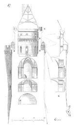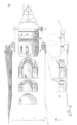 | Keywords: Coupe.tour.Charlemagne.Pierrefonds.png Drawings by Eugène Viollet-le-Duc Castle La coupe faite sur <i>ab</i> fig 57 explique l'importance de cet étage au point de vue de la défense Sur l'aire A étaient accumulés les projectiles propres à être lancés par les mâchicoulis pierres rondes cailloux de toutes grosseurs jusqu'à 40 centimètres de diamètre puisque les trous des mâchicoulis ont 42 centimètres environ Cet amas de projectiles pouvait à la rigueur atteindre le niveau du chemin de ronde B en laissant un vide dans le milieu pour le service et pour le passage des hommes par la porte C Dictionnaire raisonné de l'architecture française du XI<sup>e</sup> au XI<sup>e</sup> siècle ~ 1856 Eugène Viollet le Duc Viollet-le-Duc |