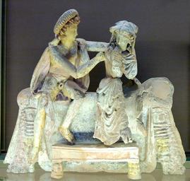 Keywords: Couple bridal bed Louvre Myr268.jpg Scene of anacalypsis husband drawing aside his newly wed wife's veil in the bridal room Terracotta 150 “100 BC From tomb 100 in Myrina now in Turkey H 28 cm 11 in W 33 cm 12 ¾ in Museum Louvre Department of Greek Etruscan and Roman Antiquities Sully first floor room 38 object history credit line Excavations of the French School at Athens 1883 accession number Myr 268 Jastrow 2006 other versions 100px Scène d ™anacalypsis mari écartant le voile de sa nouvelle épouse dans la chambre nuptiale Terre cuite 150-100 av J -C Provenance tombe 100 à Myrina actuelle Turquie Terracotta figurines from Myrina Greek antiquities in the Louvre - Room 38 beds in art Nicostratos Sitting statues of couples |