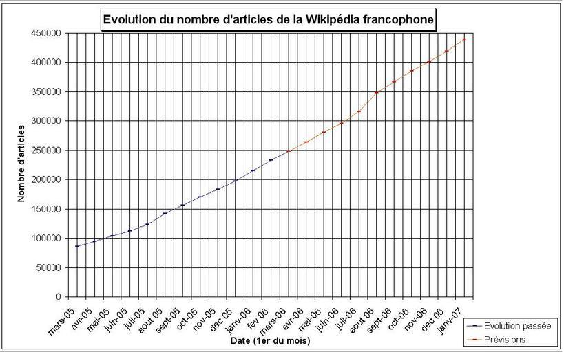 | Keywords: Courbe prévisions articles.JPG Courbe prévisionnel de l'evolution du nombre d'articles sur la wiki fr Previsions for the number of articles in the future in the fr Wiki 2006-03-05 own assumed EyOne Wikipedia statistics French Wikipedia statistics |