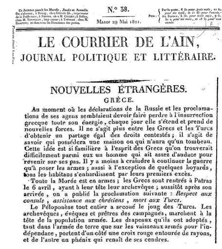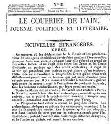 | Keywords: Courier Ain 1821 Patra+title.JPG  en News about the outbreak of the Greek Revolution in Patras 25 March/6 April 1821 el Η είδηση για την έκρηξη της Ε ανάστασης στην Πάτρα 25  αρτίου/6 Α ριλίου 1821 1821-05-29 Courrier de l' Ain newspaper 29 May 1821 p 4 http //www archives-numerisees ain fr/archives/resultats/journauxnumerises/n 100 RECH_nom 5B0 5D Courrier+de+l 27Ain type journauxnumerises anonymous other versions PD-old-70-1923 Uploaded with UploadWizard Greek Revolution 1821 Palaion Patron Germanos |