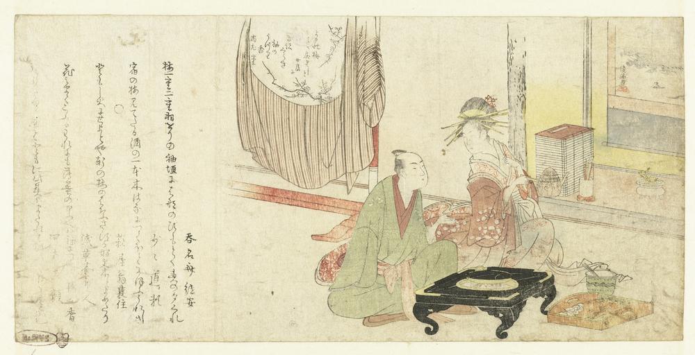 | Keywords: Courtisane schenkt thee voor haar gast-Rijksmuseum RP-P-1969-11.jpeg accession number RP-P-1969-11 Kubota Shunman; Kubota Shunman died 1820; Donmeisai Tadayasu; Shôshô Michiyori; Haginoya-ô Urasumi died 1810; Asakusaan Ichindo died 1821; Yomo Magao; Shôsadô died 1820 credit line GWToolset Rijksmuseum nl Een courtisane met een porseleine theepot serveert haar gast De man zijn kimono is uitgehangen op het rek achter Met vijf gedichten Het gedicht van de kunstenaar zelf Hij zei tegen zijn vrouw 'Ik ga even naar de avond pruimenbloesem kijken en ben zo terug' maar wat is die sterke geur op zijn mouwen Label Line mentioned on object Kubota Shunman 1757 - 1820 1795 - 1799 kleurenhoutsnede; blinddruk; lijnblok in zwart met kleurblokken Collection prenten; Japan collectie blad Height mm 138 blad Width mm 284 exhibition history Institution Rijksmuseum paper object history Acquisition 1969 object type prent PD-US PD-old Data and photography rights All data and all images made available through the API are either in the public domain or are subject to a CC0 license https //www rijksmuseum nl/en/api/terms-and-conditions-of-use cc-zero place of creation Japan Forrer 65; Jap Cat II 44 http //www rijksmuseum nl/collectie/RP-P-1969-11 http //hdl handle net/10934/RM0001 COLLECT 45500 handle Courtisane schenkt thee voor haar gast Uploaded with GWToolset Rijksmuseum RP-P-1969-11 http //www rijksmuseum nl/media/assets/RP-P-1969-11 Images uploaded by Fæ Images from the Rijksmuseum Japanese 18th-century prints in the Rijksmuseum Amsterdam |