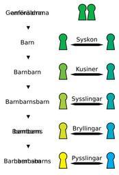 | Keywords: Cousins.svg Relationship diagram of Swedish words for siblings and cousins to the fifth generation There are regional alternatives to this terminology Relationsdiagram över terminologi för inbördes släktskap mellan personer med gemensamma anföräldrar intill femte generationen Dialektala alternativ till terminologin förekommer by dcastor 2010 Dcastor Relationship diagrams SVG diagrams Kinship Family Swedish language | ||||