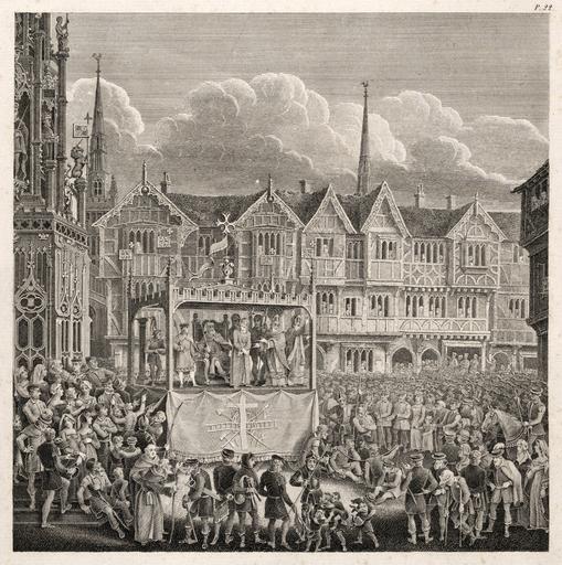 | Keywords: Coventry-mystery-pageant-thomas-sharp-david-gee-1825.jpg  Thomas Sharp 1770-1841 The image was designed and executed in copper engraving by David Gee 1793-1872 It recreates a 15th-century Passion play The Trial and Crucifixion of Christ by the Smiths' Company of Coventry Many of the details are based on written accounts including pageant wagon design itself and the people in the street The audience includes men women and children along with armed guards for the wagon men who drew the wagon from station to station minstrels clerics and a carpenter The scene on stage depicts Christ with hands bound before an enthroned Pilate Annas and Caiaphas are shown in mitred hats and a boy carries a bowl of water for Pilate to wash his hands Although somewhat speculative the image has been influential and is often reproduced Beinecke Library http //brbl-dl library yale edu/vufind/Record/3447379 Designed and engraved by Creator David Gee 1825 PD-old-100 PD-1996 <gallery>File ChesterMysteryPlay 300dpi jpg Smaller later copy </gallery> Medieval theatre Passion plays Mystery play David Gee |