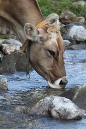 Keywords: cow animal female beef face meadow ungulate livestock fur creature bach water drink thirst