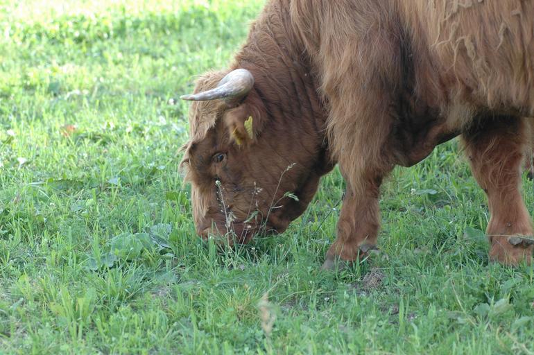 Keywords: cow beef bull highlands fur brown meadow agriculture livestock pasture nature ruminant ear tag scotland highland beef domestic cattle eat grass