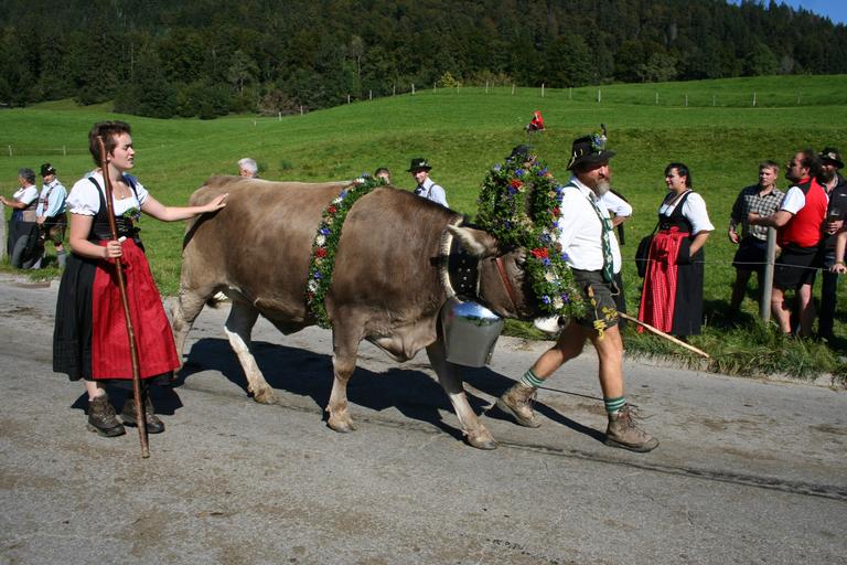 Keywords: cow wreath beef allgäu bavaria almabtrieb customs brown swiss cows tradition viehscheid leather pants bavarian