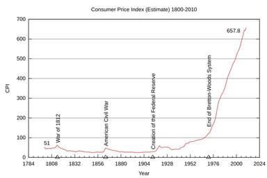 | Keywords: Cpi-2010.svg en The United States Consumer Price Index from 1800 through 2010 http //www minneapolisfed org/Research/data/us/calc/hist1800 cfm and http //upload wikimedia org/wikipedia/commons/8/88/USACPI1800 svg Aoss with work from Nkocharh 2010-08-28 In the public domain http //upload wikimedia org/wikipedia/commons/8/88/USACPI1800 svg My gnuplot setup file <pre>set terminal svg enhanced fsize 12 size 750 500 set output 'gnuplot-cpi-output svg' set datafile separator \t set style data lines set title Consumer Price Index Estimate 1800-2010 set nokey set xdata time set format x Y set timefmt Y set xtics nomirror set noy2tics set xlabel Year set ylabel CPI set grid noxtics set grid ytics Label for the creation of the Fed You shouldn't need to change this set label 1 Creation of the Federal Reserve at 1913 1 rotate point pointtype 8 offset -0 3 1 Label for the initial CPI You shouldn't need to change this set label 2 51 at 1800 1 offset first 0 71 Label for the War of 1812 You shouldn't need to change this set label 3 War of 1812 at 1814 1 rotate point pointtype 8 offset -0 3 2 Label for the Civil War You shouldn't need to change this set label 4 American Civil War at 1864 1 rotate point pointtype 8 offset -0 3 1 5 Label for Bretton-Woods You shouldn't need to change this set label 5 End of Bretton-Woods System at 1971 1 rotate point pointtype 8 offset -0 3 4 5 Label for the current CPI You need to change this Looks like the offset's y needs to be about 20 more than the CPI value we're labeling set label 6 657 8 at 1990 1 offset first 0 640 plot 'cpidata dat' using 1 2</pre> My cpidata dat data file <pre> Consumer Price Index Estimate Data taken from http //www minneapolisfed org/Research/data/us/calc/hist1800 cfm on 28 August 2010 Year CPI 1800 51 1801 50 1802 43 1803 45 1804 45 1805 45 1806 47 1807 44 1808 48 1809 47 1810 47 1811 50 1812 51 1813 58 1814 63 1815 55 1816 51 1817 48 1818 46 1819 46 1820 42 1821 40 1822 40 1823 36 1824 33 1825 34 1826 34 1827 34 1828 33 1829 32 1830 32 1831 32 1832 30 1833 29 1834 30 1835 31 1836 33 1837 34 1838 32 1839 32 1840 30 1841 31 1842 29 1843 28 1844 28 1845 28 1846 27 1847 28 1848 26 1849 25 1850 25 1851 25 1852 25 1853 25 1854 27 1855 28 1856 27 1857 28 1858 26 1859 27 1860 27 1861 27 1862 30 1863 37 1864 47 1865 46 1866 44 1867 42 1868 40 1869 40 1870 38 1871 36 1872 36 1873 36 1874 34 1875 33 1876 32 1877 32 1878 29 1879 28 1880 29 1881 29 1882 29 1883 28 1884 27 1885 27 1886 27 1887 27 1888 27 1889 27 1890 27 1891 27 1892 27 1893 27 1894 26 1895 25 1896 25 1897 25 1898 25 1899 25 1900 25 1901 25 1902 26 1903 27 1904 27 1905 27 1906 27 1907 28 1908 27 1909 27 1910 28 1911 28 1912 29 1913 29 7 1914 30 1 1915 30 4 1916 32 7 1917 38 4 1918 45 1 1919 51 8 1920 60 0 1921 53 6 1922 50 2 1923 51 1 1924 51 2 1925 52 5 1926 53 0 1927 52 0 1928 51 3 1929 51 3 1930 50 0 1931 45 6 1932 40 9 1933 38 8 1934 40 1 1935 41 1 1936 41 5 1937 43 0 1938 42 2 1939 41 6 1940 42 0 1941 44 1 1942 48 8 1943 51 8 1944 52 7 1945 53 9 1946 58 5 1947 66 9 1948 72 1 1949 71 4 1950 72 1 1951 77 8 1952 79 5 1953 80 1 1954 80 5 1955 80 2 1956 81 4 1957 84 3 1958 86 6 1959 87 3 1960 88 7 1961 89 6 1962 90 6 1963 91 7 1964 92 9 1965 94 5 1966 97 2 1967 100 0 1968 104 2 1969 109 8 1970 116 3 1971 121 3 1972 125 3 1973 133 1 1974 147 7 1975 161 2 1976 170 5 1977 181 5 1978 195 4 1979 217 4 1980 246 8 1981 272 4 1982 289 1 1983 298 4 1984 311 1 1985 322 2 1986 328 4 1987 340 4 1988 354 3 1989 371 3 1990 391 4 1991 408 0 1992 420 3 1993 432 7 1994 444 0 1995 456 5 1996 469 9 1997 480 8 1998 488 3 1999 499 1 2000 515 8 2001 530 1 2002 538 8 2003 551 0 2004 565 7 2005 584 8 2006 603 5 2007 620 7 2008 644 4 2009 642 2 2010 657 8</pre> cc-zero Inflation graphs Consumer price index |