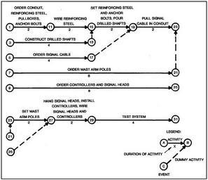 Keywords: CPM Network Diagram.jpg en Example of CPM Network Diagram The critical path method CPM has proved a successful method for planning organizing and controlling projects Initially this management tool outlines the project graphically in the form of a network diagram This representation shown in Figure 12-3 illustrates The required operational sequence Which operations are concurrent and Which must be completed before others can be initiated CPM operations are referred to as activities In Figure 12-3 an example of the application of CPM to the installation of a traffic control system the activities necessary to complete the project are denoted by a line with an arrowhead The circled numbers represent events which mark the beginning or completion of an activity Dashed lines represent dummy activities which do not require any time but must be completed before another event can occur The number below the activity represents the amount of time required to complete the activity The critical path represents the project duration In the example the critical path is represented by the activities associated with events 1-11-15-19-23-27-29-31 In the example if activity 7-21 required a time of 10 instead of 8 then the critical path would become 7-21-23-27-29-31 because this sequence of activities would require a longer time In this case the receipt of mast arm poles would establish the critical path because they must be received before they can be set in place http //ops fhwa dot gov/publications/fhwahop06006/chapter_12 htm in Traffic Control Systems Handbook Chapter 12 Design and Implementation United States Department of Transportation - Federal Highway Administration Last modified January 23 2009 PD-USGov CPM diagrams |