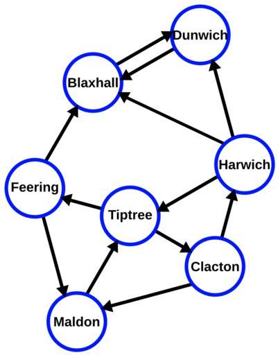 Keywords: CPT-Graphs-directed-unweighted.svg en directed unweighted graph of East Anglian Towns own Pluke Cc-zero CPT-Graphs- un directed- un weighted Graphs with 7 vertices Graph algorithms