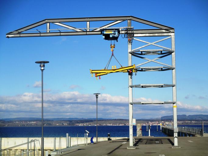 Keywords: crane schifsskran impressive boat harbour lake lake constance sky background pier altnau thurgau switzerland