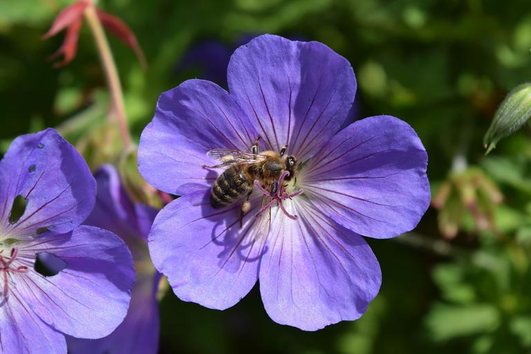 Keywords: cranesbill flower close bee insect pollination hummel garden summer