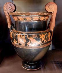 Keywords: Crater Actaeon Louvre CA3482.jpg Painter of the Woolly Satyrs Actaeon's death Artemis drives a chariot drawn by a team of deer To the right a man reports Actaeon's death to his parents Aristaeus and Autonoe The scene is probably based on Aeschylus' lost play The Toxitides which dealt with the story of Actaeon Side A from an Attic red-figure volute crater ca 450 “440 BC Mort d'ActĂ©on ArtĂ©mis conduit un char tirĂ© par deux cerfs Ă droite un homme rapporte la mort d'ActĂ©on Ă ses parents AristĂ©e et AutonoĂ© La scène est probablement inspirĂ©e par la tragĂ©die perdue d'Eschyle Les Toxitides qui traitait d'ActĂ©on Face A d'un cratère Ă volutes attique Ă figures rouges v 450-440 av J -C H 51 cm 20 in Diam 33 1 cm 13 in Museum Louvre Department of Greek Etruscan and Roman antiquities in the Louvre Sully first floor room 43 object history credit line Purchase 1957 accession number CA 3482 Marie-Lan Nguyen 2006 other versions <gallery> File Krater Aktaion Louvre CA3482 n2 jpg Detail File Krater Aktaion Louvre CA3482 n3 jpg </gallery> Actaeon in ancient Greek pottery Artemis in ancient Greek pottery Deer in ancient Greek pottery Dogs in ancient Greek art Volute kraters Painter of the Woolly Satyrs Greek antiquities in the Louvre - Room 43 450s BC pottery in France Louvre 440s BC pottery in France Louvre Meanders in ancient Greek pottery |