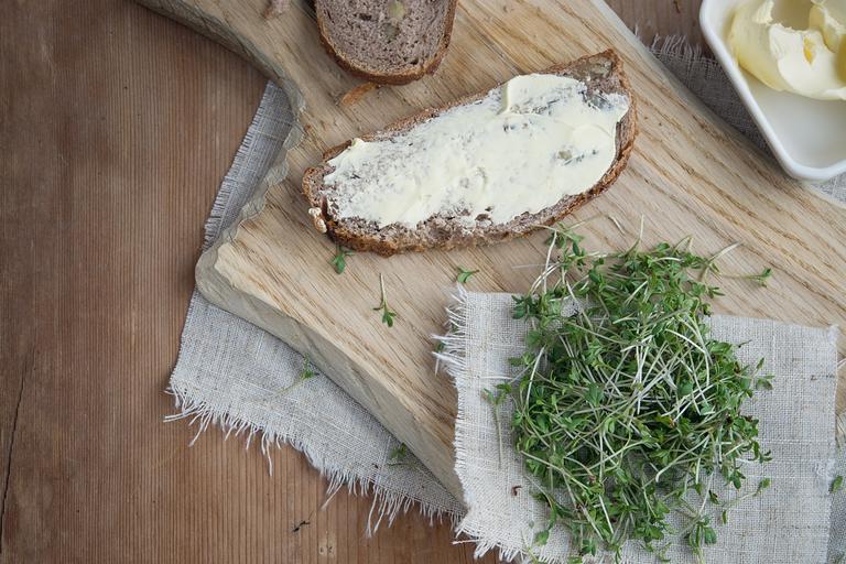 Keywords: cress herbs green natural product bread butter bread and butter wooden board cutting board country life close text freedom