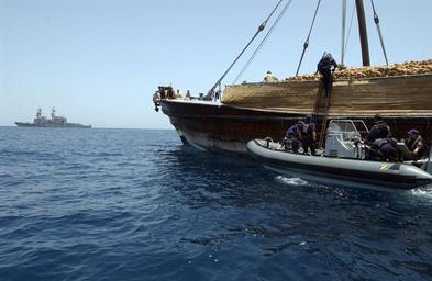 Keywords: Crew members of HMNZS Te Mana (F111) board a dhow, May 6, 2004.jpg en 040506-N-7586B-322 Gulf of Oman May 6 2004 - Crew members assigned to the New Zealand Frigate HMNZS Te Manaís F111 Boarding Team use a Rigid Hull Inflatable Boat RHIB to board a dhow as they conduct searches of fishing vessels in the area The multinational Combined Task Force One Five Zero CTF-150 was established to monitor inspect board and stop suspect shipping to pursue the war on terrorism and includes operations currently taking place in the North Arabia Sea to support Operation Iraqi Freedom Countries contributing to CTF-150 currently include Australia Canada France Germany Italy Pakistan New Zealand Spain United Kingdom and the United States U S Navy photo by Photographer's Mate 1st Class Bart Bauer RELEASED http //www navy mil/view_image asp id 14076 U S Navy photo by Photographer's Mate 1st Class Bart Bauer 2004-05-06 PD-USGov-Military-Navy PD-USGov-Military-Navy Check categories 2008 November 13 en wikipedia Dhow Sailing Wooden vessels in Gulf of Oman HMNZS Te Mana F111 Rigid-hulled inflatable boats Visit Board Search and Seizure |