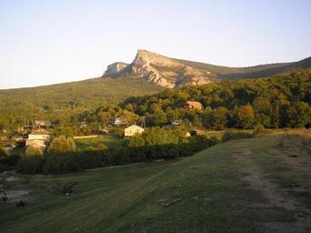 Keywords: crimea landscape mountains scenic sky clouds nature outside forest trees vista summer spring country countryside rural woods buildings village