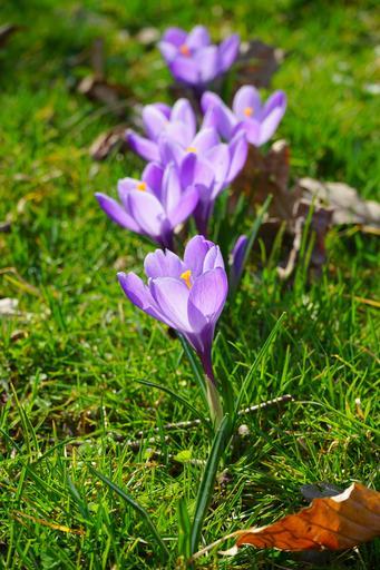 Keywords: crocus in row and member series in a row flowers plant spring frühlingsblüher violet purple schwertliliengewaechs iridaceae ornamental plant