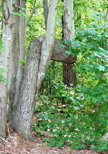 Keywords: crooked tree horizontal trunk anomaly wood forest knotted outdoors twig twisted bark bent natural curved leaves scenic rural view bizarre tall mighty thicket wild dramatic sunny