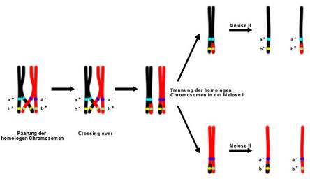 | Keywords: Cross-over.jpg Schematische Darstellung der genetischen Rekombination väterlicher und mütterlicher Gene durch Crossing-over Gezeigt ist die Frühphase der Meiose I mit anschließender Trennung der homologen Chromosomen und schließlich der Bildung von Keimzellen mit 1-Chromatid-Chromosomen in der Meiose II Es sind zwei Gene a und b auf den Chromosomen markiert die in den Ausprägungen + und - vorliegen Durch Crossing-over entstehen die neuen Allelkombination a+/b+ und a-/b- Autor Gebintit Nach verschiedenen Literaturvorlagen biology Chromosomes |
