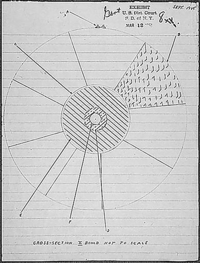 | Keywords: Cross-section Sketch of Atomic Bomb - NARA - 278753.jpg Scope and content This is a cross-section sketch of an atomic bomb produced by David Greenglass a defendant in this espionage case General notes Assistant Prosecutor Roy Cohn moved to introduce David Greenglass's cross-section sketch of the atomic bomb into evidence Defense Attorney Emanual Bloch asked to have the sketch impounded so that it remains secret from the Court the jury and counsel As a result of this controversial tactic the sketch remained sealed until lawyers Marshall Perlin and William Kuntsler obtained its release in 1966 278753 Local identifier Department of Justice Office of the U S Attorney for the Southern Judicial District of New York 1870 - Most Recent <br /> Office of the Attorney General Office of the U S Attorney for the Southern Judicial District of New York 04/09/1814 - 1870 Predecessor NARA-Place New York New York state United States North and Central America inhabited place 4191644 40 7 -74 <br /> NARA's Northeast Region New York City NRAAN 201 Varick Street New York NY 10014-4811 1951-03-12 Record group Record Group 118 Records of U S Attorneys 1821 - 1994 Record group ARC 447 Selected Case Files compiled 1847 - 1986 Series ARC 278744 File unit Exhibits from the Julius and Ethel Rosenberg Case File 03/13/1951 - 03/27/1951 File unit ARC 278745 Variant control numbers NAIL Control Number NRAN-118-SDUSATTY-114868-7 11 <br /> Other Identifier 05361<br /> This is the NARA Internal Exhibit Tracking Number for the Public Vaults exhibit <br /> Search Identifier siLearning Center<br /> Search Identifier siNational History Standard Era 9 Other versions <gallery> File Cross-section_Sketch_of_Atomic_Bomb_-_NARA_-_278753 tif tif File Cross-section_Sketch_of_Atomic_Bomb_-_NARA_-_278753 jpg jpg </gallery> NARA-cooperation PD-USGov Nuclear weapon schemas Espionage |