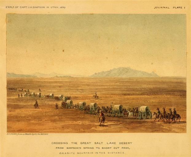 | Keywords: Crossing the Great Salt Lake Desert From Simpson's Spring to Short Cut Pass, Granite Mountain in the distance. - NARA - 305637.jpg Scope and content This sketch shows a wagon train moving across the desert This sketch is Plate I in Lt J H Simpson's 1859 Journal of Explorations in Utah General notes 305637 Local identifier 77-CWMF-MISC120 1 War Department Office of the Chief of Engineers 1818 - 09/18/1947 NARA-Author Young John J Artist 4400191 <br /> Cartographic and Architectural Records Section Special Media Archives Services Division NWCS-C National Archives at College Park 8601 Adelphi Road College Park MD 20740-6001 1859 - 1859 Record group Record Group 77 Records of the Office of the Chief of Engineers 1789 - 1999 Record group ARC 406 Civil Works Map File compiled 1800 - 1947 Series ARC 305566 File unit File unit ARC Variant control numbers NAIL Control Number NWDNC-77-CWMF-MISC120 1 Other versions <gallery> File Crossing_the_Great_Salt_Lake_Desert_From_Simpson's_Spring_to_Short_Cut_Pass _Granite_Mountain_in_the_distance _-_NARA_-_305637 tif tif File Crossing_the_Great_Salt_Lake_Desert_From_Simpson's_Spring_to_Short_Cut_Pass _Granite_Mountain_in_the_distance _-_NARA_-_305637 jpg jpg </gallery> NARA-cooperation PD-USGov Great Salt Lake Desert Granite Peak Tooele County Utah Granite Mountain Tooele County Utah Mountains of the Great Basin USA in Utah Dugway Range Wagon trains |