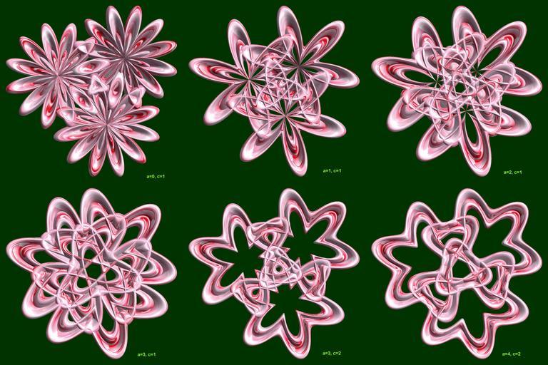 | Keywords: mathematica 3d cg parametricplot3d texture torus 輪環 りんかん ドーナツ どーなつ 六芒星 ろくぼうせい 六光星 ろくこうせい 六稜星 ろくりょうせい プログラム コード code program algorithm コード アルゴリズム hexagram geometric sculpture geometricsculpture shape geometry sculpture mapping テクスチャ マッピング 模様 もよう abstract 抽象 ちゅうしょう アブストラクト design pattern デザイン パターン graphic グラフィック グラフィクス structure 意匠 構造 symmetry 対称性 たいしょうせい シンメトリー 対称 たいしょう algorithm plant blossom flower outdoor flower cluster a = 6;(* center hole size of a torus *) b = 6;(* hexa-torus *) c = 4;(* distance from the center of rotation *) d = 3;(* number of torus *) SetOptions[ParametricPlot3D, PlotRange -> Full, Mesh -> None, Boxed -> False, Axes -> None, PlotPoints -> 200, ImageSize -> 1200, Background -> Darker[Green, 0.8], PlotStyle -> Directive[Specularity[White, 50], Texture[Import["D:/tmp/86.jpg"]]], TextureCoordinateFunction -> ({#4 , #5} &), Lighting -> "Neutral"]; x = (a - Cos[t] - Sin[b s]) Cos[s + Pi/(2 b)] + c; y = Sin[t] Cos[t] + c; z = (a - Cos[t] - Sin[b s]) Sin[s] + c; rot = Table[{x, y, z}.RotationMatrix[2 i Pi/d, {0, 1, 0}], {i, d}]; ParametricPlot3D[rot, {t, 0, 2 Pi}, {s, 0, 2 Pi}] (*--- The Texture *) a = 6;(* center hole size of a torus *) b = 6;(* hexa-torus *) c = 4;(* distance from the center of rotation *) d = 3;(* number of torus *) SetOptions[ParametricPlot3D, PlotRange -> Full, Mesh -> None, Boxed -> False, Axes -> None, PlotPoints -> 200, ImageSize -> 1200, Background -> Darker[Green, 0.8], PlotStyle -> Directive[Specularity[White, 50], Texture[Import["D:/tmp/86.jpg"]]], TextureCoordinateFunction -> ({#4 , #5} &), Lighting -> "Neutral"]; x = (a - Cos[t] - Sin[b s]) Cos[s + Pi/(2 b)] + c; y = Sin[t] Cos[t] + c; z = (a - Cos[t] - Sin[b s]) Sin[s] + c; rot = Table[{x, y, z}.RotationMatrix[2 i Pi/d, {0, 1, 0}], {i, d}]; ParametricPlot3D[rot, {t, 0, 2 Pi}, {s, 0, 2 Pi}] (*--- The Texture *) |