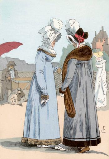 Keywords: Crossing the Pont des Arts, 1816.jpg Artwork This plate depicts two women crossing the Pont des Arts which is also known as the Passerelle des Arts It was built from 1802 to 1804 and was the first Parisian bridge to be made of iron It was also the first bridge in Paris to be exclusively reserved for pedestrians The women wear very high-waisted dresses Both women wear a large white feather in their hats symbolic of the white plume of Henri IV's famous battle cry Ralliez-vous à mon panache blanc and made popular by the 1814 restoration of Louis XVIII on the throne Restoration also brought back various styles especially those denoting luxury from the Ancien Regime The woman on the left wears an 'old-fashioned' lace collar and the resurgence of luxury materials such as fur are indicative of feminine styles of the Restoration period 1898 1 colored plate 10 x 15 cm Institution Brown University Library object history exhibition history credit line accession number 1145807672241577 PD-old-100 Images of Paris from the Brown University Library Les modes de Paris 031 1816 in Paris Fashion in 1816 Historical images of Pont des Arts Pont des Arts 1804-1979 Fur scarves in art Fur garments in art Fur fashion in 1898 |