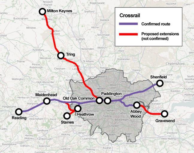 Keywords: Crossrail extensions.png en Map of proposed extensions to the planned Crossrail network in London UK as outlined in the 2011 http //www networkrailmediacentre co uk/imagelibrary/downloadMedia ashx MediaDetailsID 4858 Rail Utilisation Strategy document of 2011 p 153 Extensions are proposed to Reading Tring/Milton Keynes Gravesend and Staines with a spur from Heathrow to the Maidenhead/Reading line 2014-01-18 16 15 41 own Cnbrb OpenStreetMap Greater London cc-zero Uploaded with UploadWizard Maps of Crossrail London Tring railway station West Coast Main Line Rail transport in Hertfordshire Gravesend railway station Reading railway station Staines railway station Heathrow Express Public transport at London Heathrow Airport Paddington station Proposed or planned infrastructure in London |