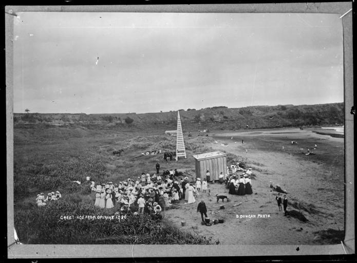 | Keywords: blackandwhite monochrome photo border outdoor black and white Crowd at a picnic at the beach at Opunake, with a man standing beside billies heating over a fire. Photograph taken by David Duncan, photographer in Opunake (see Wise's Post Office Directory 1914) Inscriptions: Inscribed - Photographer's title on negative -bottom left: Greetings from Opunake. [No.] 1980.bottom right: D. Duncan Photo. Quantity: 1 b&w original negative(s). Physical Description: Dry plate glass negative 4.5 x 6.5 inches Duncan, David, fl 1910s. Crowd of people at the beach at Opunake - Photograph taken by David Duncan. Price, William Archer, 1866-1948 :Collection of post card negatives. Ref: 1/2-000060-G. Alexander Turnbull Library, Wellington, New Zealand. natlib.govt.nz/records/23034153 Crowd at a picnic at the beach at Opunake, with a man standing beside billies heating over a fire. Photograph taken by David Duncan, photographer in Opunake (see Wise's Post Office Directory 1914) Inscriptions: Inscribed - Photographer's title on negative -bottom left: Greetings from Opunake. [No.] 1980.bottom right: D. Duncan Photo. Quantity: 1 b&w original negative(s). Physical Description: Dry plate glass negative 4.5 x 6.5 inches Duncan, David, fl 1910s. Crowd of people at the beach at Opunake - Photograph taken by David Duncan. Price, William Archer, 1866-1948 :Collection of post card negatives. Ref: 1/2-000060-G. Alexander Turnbull Library, Wellington, New Zealand. natlib.govt.nz/records/23034153 |