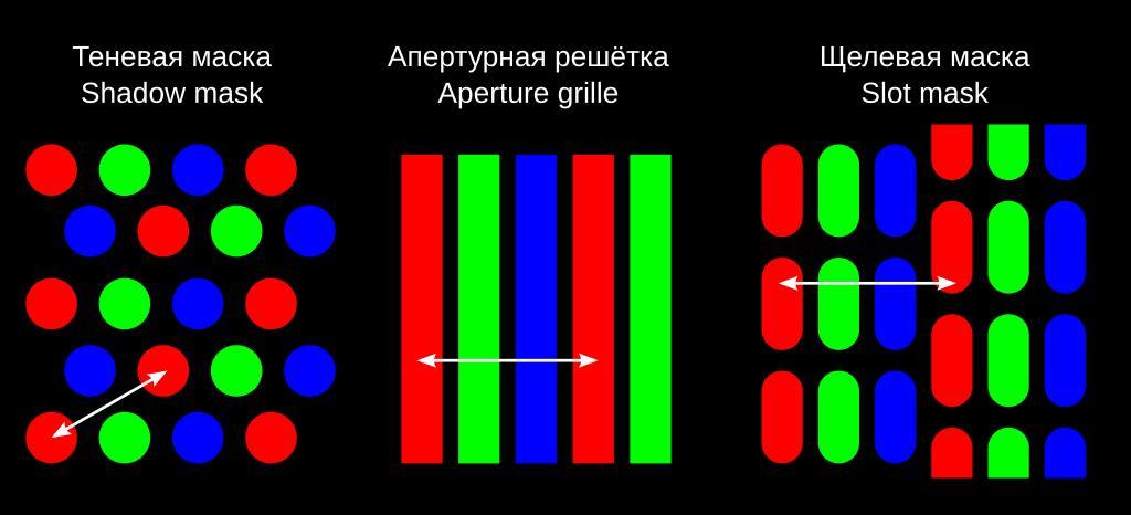 Keywords: CRT mask types en-ru.svg CRT mask types ways of measuring dot pitch English+Russian Own 2007-12-08 User Mercury13 PD-ineligible CRT colors Displays
