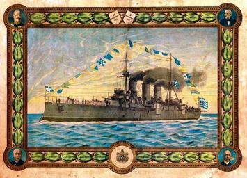 | Keywords: Cruiser Averof lithograph by Christidis.jpg  Averof for its role as the Greek fleet's flagship in the Balkan Wars Clockwise from top left are depicted King Constantine I of Greece the businessman Georgios Averoff Admiral Pavlos Kountouriotis and Prime Minister Eleftherios Venizelos The laurels bear the names of the Greek islands and coastal towns taken by the Greek navy and the two shields the dates of the two great naval battles of Elli and Lemnos Θ/Κ ΑΒΕΡΩΦ για τη δράση του στους Βαλκανικούς Πολέμους Δεξιόστροφα α ό  άνο αριστερά εικονίζονται ο βασιλιάς Κωνσταντίνος Α' της Ελλάδας ο εθνικός ευεργέτης Γεώργιος Αβέρωφ ο ναύαρχος Παύλος Κουντουριώτης και ο  ρωθυ ουργός Ελευθέριος Βενιζέλος Στα φύλλα δάφνης αναγράφονται τα ονόματα νήσων και  αραθαλασσίων  εριοχών  ου α ελευθερώθηκαν α ό τον Ελληνικό Στόλο και στους δυο θυρεούς αναγράφονται οι ημερομηνίες των ναυμαχιών της Έλλης και της Λήμνου 2010-05-10 scanned from original Creator Sotirios Christidis Custom license marker 2012 01 29 PD-old-70 Uploaded with UploadWizard Georgios Averof ship 1910 Lithographs of Greece Pavlos Kountouriotis Constantine I of Greece Eleftherios Venizelos in art Sotirios Christidis |