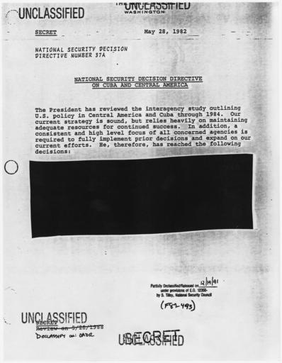 | Keywords: Cuba and Central America - NARA - 198197.jpg Scope and content General notes 198197 Local identifier President 1981-1989 Reagan National Security Council 1981 - 1989 Ronald Reagan Library NLRR 40 Presidential Drive Simi Valley CA 93065-0600 1982-05-28 Record group Collection RR-NSC Numbered National Security Policy Papers 1981 - 1989 Record group ARC 1189 National Security Decision Directives compiled 02/25/1981 - 01/19/1989 Series ARC 198166 File unit File unit ARC Variant control numbers NAIL Control Number NLS-NSC-NSDD-37A Other versions <gallery> File Cuba_and_Central_America_-_NARA_-_198197 tif tif File Cuba_and_Central_America_-_NARA_-_198197 jpg jpg </gallery> NARA-cooperation PD-USGov Presidential Decision Directives Reagan |