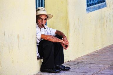 Keywords: cuba smoking man cigar face house entrance straw hat