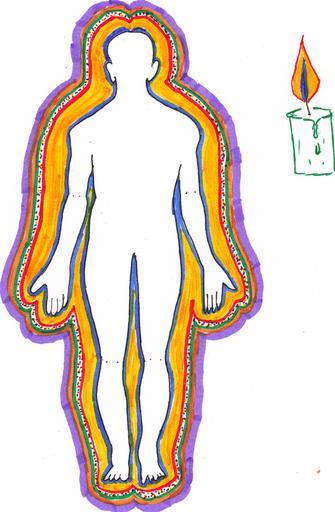 Keywords: Cuerpos sutiles.jpg es Dibujo de la silueta humana realizado a mano alzada en lapiz de grafito y coloreado al rededor con marcadores de tinta de agua de diferentes colores Venezuela Ricarda Pantoja P abril de 2006 Subtle bodies