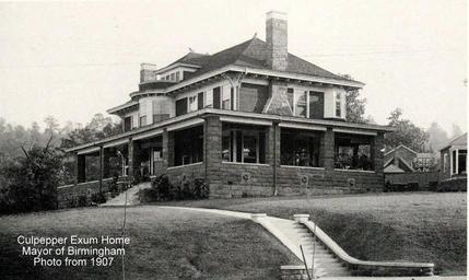 Keywords: outdoor architecture building Culpepper E. Exum, Sr (born June 19, 1866 in Marion County, South Carolina, died 1920) was a founder and president of the Birmingham Fertilizer Company and the 15th Mayor of Birmingham. His term of office spanned the city's change from a Mayor-Aldermen form of government to a City Commission. Culpepper was the tenth of eleven children born to Robert Benjamin and Mary Jane Culpepper Exum of Marion County (now Florence County), South Carolina. He spent his childhood on the family farm and, at around the age of 10, accompanied his father to Scranton and Charleston, South Carolina, where he attended public schools. Exum completed high school at Oak Ridge, North Carolina and went to work as a clerk at a variety of businesses, including a brokerage of naval stores, a cotton factor, and wholesale grocery house. He and a brother opened a country store in Orangeburg County, but Culpepper soon left to become a traveling salesman for a Baltimore grocery wholesaler, and then a clerk for a Charleston clothing store. Later, while working as a salesman for a wholesale clothing company, he had the opportunity to learn about the owner's other enterprise, a fertilizer factory. Convinced of the potential for that industry, he began representing the Chicora Fertilizing Company in Alabama and Georgia. In 1897 Exum and fellow Chicora salesman Frank Burbridge relocated to Birmingham where they opened their own Birmingham Fertilizer Company. The business was an immediate success and Burbridge left to start another similar firm in Charleston, with Exum as a major shareholder. Meanwhile, Exum's investments also expanded in Birmingham. He became a director of the First National Bank of Birmingham and owned the real estate on which the Alabama State Fairgrounds was developed. In 1904 he was elected president of the Birmingham Chamber of Commerce. As director of the Alabama State Fair Association, he offered the Fair Grounds as a location to display the Vulcan statue after the culmination of the St Louis World's Fair. In 1905 Exum married the former Lestra Kinney. The couple had four children: Lestra K., Culpepper, Jr, Frank K. and Jane. Exum was elected Mayor of Birmingham in 1910. Shortly thereafter a citizen-led legislative change created a Birmingham City Commission to replace the Board of Aldermen. Exum remained in office as President of the Commission until November 1913. Exum served alongside A. O. Lane and James Weatherly on the Commission, which was charged with bringing a "businesslike" competency to City Hall. In order to reign in expenditures and cover a deficit of $583,144 the commissioners abolished several offices and reduced or eliminated certain inefficient city services, including a temporary abolishment of the Department of Parks. They also renegotiated interest payments on the city's deposits by changing banks. The task of consolidating utilities and services provided by the numerous municipalities annexed into the city by the Greater Birmingham act was the primary task of Exum's administration. While in office, Exum organized the Steel Cities Chemical Company. Exum died in 1920. (source: Bhamwiki.com) Culpepper E. Exum, Sr (born June 19, 1866 in Marion County, South Carolina, died 1920) was a founder and president of the Birmingham Fertilizer Company and the 15th Mayor of Birmingham. His term of office spanned the city's change from a Mayor-Aldermen form of government to a City Commission. Culpepper was the tenth of eleven children born to Robert Benjamin and Mary Jane Culpepper Exum of Marion County (now Florence County), South Carolina. He spent his childhood on the family farm and, at around the age of 10, accompanied his father to Scranton and Charleston, South Carolina, where he attended public schools. Exum completed high school at Oak Ridge, North Carolina and went to work as a clerk at a variety of businesses, including a brokerage of naval stores, a cotton factor, and wholesale grocery house. He and a brother opened a country store in Orangeburg County, but Culpepper soon left to become a traveling salesman for a Baltimore grocery wholesaler, and then a clerk for a Charleston clothing store. Later, while working as a salesman for a wholesale clothing company, he had the opportunity to learn about the owner's other enterprise, a fertilizer factory. Convinced of the potential for that industry, he began representing the Chicora Fertilizing Company in Alabama and Georgia. In 1897 Exum and fellow Chicora salesman Frank Burbridge relocated to Birmingham where they opened their own Birmingham Fertilizer Company. The business was an immediate success and Burbridge left to start another similar firm in Charleston, with Exum as a major shareholder. Meanwhile, Exum's investments also expanded in Birmingham. He became a director of the First National Bank of Birmingham and owned the real estate on which the Alabama State Fairgrounds was developed. In 1904 he was elected president of the Birmingham Chamber of Commerce. As director of the Alabama State Fair Association, he offered the Fair Grounds as a location to display the Vulcan statue after the culmination of the St Louis World's Fair. In 1905 Exum married the former Lestra Kinney. The couple had four children: Lestra K., Culpepper, Jr, Frank K. and Jane. Exum was elected Mayor of Birmingham in 1910. Shortly thereafter a citizen-led legislative change created a Birmingham City Commission to replace the Board of Aldermen. Exum remained in office as President of the Commission until November 1913. Exum served alongside A. O. Lane and James Weatherly on the Commission, which was charged with bringing a "businesslike" competency to City Hall. In order to reign in expenditures and cover a deficit of $583,144 the commissioners abolished several offices and reduced or eliminated certain inefficient city services, including a temporary abolishment of the Department of Parks. They also renegotiated interest paymen
