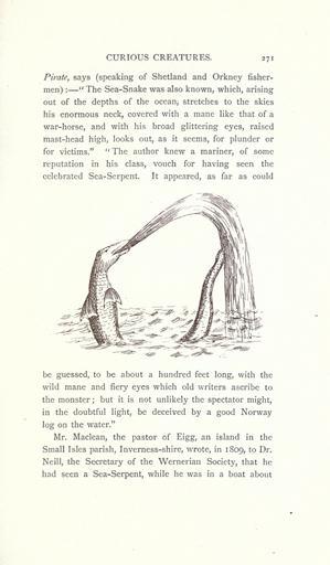 Keywords: Curious creatures in zoology (15569484002).jpg CURIOUS CREATURES <br> 271 <br> Pirate says speaking of Shetland and Orkney fisher- <br> men The Sea-Snake was also known which arising <br> out of the depths of the ocean stretches to the skies <br> his enormous neck covered with a mane like that of a <br> war-horse and with his broad glittering eyes raised <br> mast-head high looks out as it seems for plunder or <br> for victims The author knew a mariner of some <br> reputation in his class vouch for having seen the <br> celebrated Sea-Serpent It appeared as far as could <br> be guessed to be about a hundred feet long with the <br> wild mane and fiery eyes which old writers ascribe to <br> the monster ; but it is not unlikely the spectator might <br> in the doubtful light be deceived by a good Norway <br> log on the water <br> Mr Maclean the pastor of Eigg an island in the <br> Small Isles parish Inverness-shire wrote in 1809 to Dr <br> Neill the Secretary of the Wernerian Society that he <br> had seen a Sea-Serpent while he was in a boat about 23575026 76213 32031 Page 271 Text http //www biodiversitylibrary org/page/23575026 1890 10 5962/bhl title 32031 Ashton John Biodiversity Heritage Library Curious creatures in zoology; with 130 illus throughout the text Sea Serpents Monsters Are Real Animals University of California Libraries archive org bhl page 23575026 dc identifier http //biodiversitylibrary org/page/23575026 bhlMonstersRreal Halloween sea serpent university of california libraries archive org bhlmonstersrreal Information field Flickr posted date ISOdate 2014-10-19 CC-BY-2 0 BioDivLibrary https //flickr com/photos/61021753 N02/15569484002 2015-08-25 20 53 51 cc-by-2 0 PD-old-70-1923 sea serpent Curious creatures in zoology Photos uploaded from Flickr by Fæ using a script