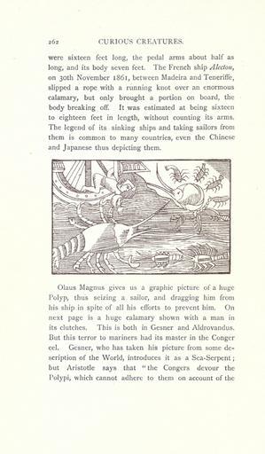Keywords: Curious creatures in zoology (15568638285).jpg 262 CURIOUS CREATURES <br> were sixteen feet long the pedal arms about half as <br> long and its body seven feet The French ship Alccton <br> on 3Oth November 1861 between Madeira and Teneriffe <br> slipped a rope with a running knot over an enormous <br> calamary but only brought a portion on board the <br> body breaking off It was estimated at being sixteen <br> to eighteen feet in length without counting its arms <br> The legend of its sinking ships and taking sailors from <br> them is common to many countries even the Chinese <br> and Japanese thus depicting them <br> Olaus Magnus gives us a graphic picture of a huge <br> Polyp thus seizing a sailor and dragging him from <br> his ship in spite of all his efforts to prevent him On <br> next page is a huge calamary shown with a man in <br> its clutches This is both in Gesner and Aldrovandus <br> But this terror to mariners had its master in the Conger <br> eel Gesner who has taken his picture from some de- <br> scription of the World introduces it as a Sea-Serpent ; <br> but Aristotle says that the Congers devour the <br> Polypi which cannot adhere to them on account of the 23575017 76213 32031 Page 262 Text http //www biodiversitylibrary org/page/23575017 1890 10 5962/bhl title 32031 Ashton John NameFound Magnus Biodiversity Heritage Library Curious creatures in zoology; with 130 illus throughout the text Monsters Are Real Animals University of California Libraries archive org bhl page 23575017 dc identifier http //biodiversitylibrary org/page/23575017 bhlMonstersRreal Halloween university of california libraries archive org bhlmonstersrreal Information field Flickr posted date ISOdate 2014-10-19 CC-BY-2 0 BioDivLibrary https //flickr com/photos/61021753 N02/15568638285 2015-08-25 20 55 59 cc-by-2 0 PD-old-70-1923 Curious creatures in zoology Photos uploaded from Flickr by Fæ using a script